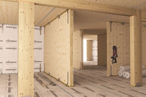 Hakron Houtbouw is de jongste telg in de familie. Het merk werd in 2023 tijdens de Bouwbeurs officieel gelanceerd. ‘We richten ons vooral op bevestigingstechnieken voor massieve houtbouw en houtskeletbouw,’ legt Kevin van Raan, accountmanager bij Hakron, uit. ‘Maar we kijken ook breder dan dat. We vragen ons steeds af wat een houten bouwwerk nodig heeft om goed gemonteerd te worden, water- en winddicht te zijn én akoestisch ontkoppeld. Zo ontwikkelen we producten die écht bij houtbouw passen.’ Van Raan benadrukt dat duurzaamheid hierbij een belangrijke rol speelt: ‘Neem de Seal band of de Vaper in Green 200 van Rothoblaas die we inzetten voor binnenwerk. Beide producten zijn op papierbasis, ontwikkeld met oog op minimale milieuschade. Bij veel van onze andere producten, zoals blinde verbindingen van aluminium of akoestische strips en matten, houden we rekening met circulariteit en losmaakbaarheid.’
